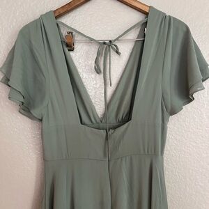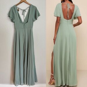 Lulus Promise Of Love Sage Brush Flutter Sleeve Maxi Dress will bring a lifetime of cherished memories and togetherness! Lightweight woven chiffon shapes this alluring dress with a deep V-neckline, a gathered bodice, and double-tiered flutter sleeves. A high, fitted empire waist sits atop a flowy, maxi skirt with a sexy, thigh-high side slit. Turn around to reveal a cutout back with a flirty tying detail. Hidden back zipper/clasp.