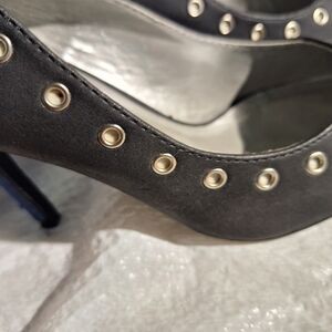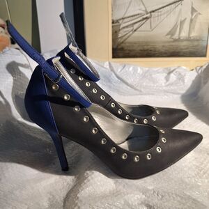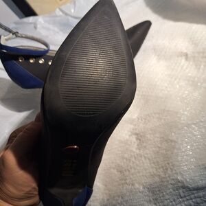 These Promise women's shoes have a professional type of aesthetic. They are 3/4 a black faux suede feel and 1/4 blue, The stiletto heel is 3 3/4" high and the outer sole is rubberized and textured. These have a pointed toe and a bit of padding on the inner sole. They are in nice pre-owned condition.
