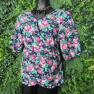 Promises Tops Women 1XL Blue V Neckline Peplum Blouse Floral Print 0020