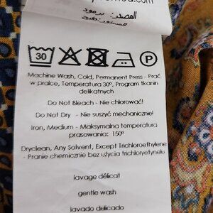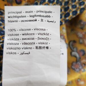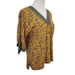Promod V-neck blouse. It has three quarter sleeves with a high low hemline. It is mustard yellow paisley print. the neckline and cuff are geometric print.
