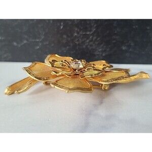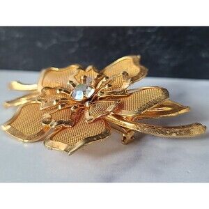 This is a vintage gold tone metal floral shaped brooch with clear prong set clear rhinestone in the center.