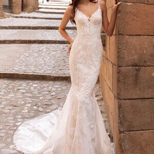 The most beautiful detailed mermaid wedding dress! It has wild bursts of flowers and dainty pearl straps. There are just the right amount of sequins to catch the light and absolutely radiate in photos. I wore it once and had it cleaned and it looks brand new. I did get it altered and a picture of my bridal contract is uploaded. It's size 4 33 X 27 X 37. I've never been the girl who wanted to preserve my wedding dress. I want a bride to feel beautiful in this just like I did.