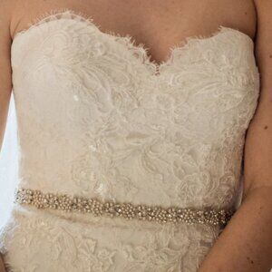 The crystal beaded belt is not attached, but can be included (32”). I also have the original crepe belt that was included at purchase (29"). It is white and made of the same material as the dress.