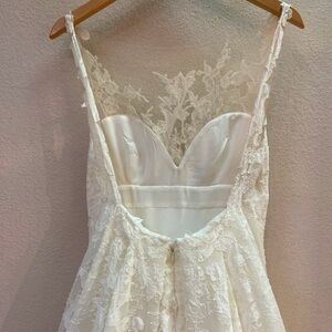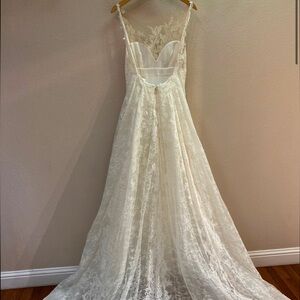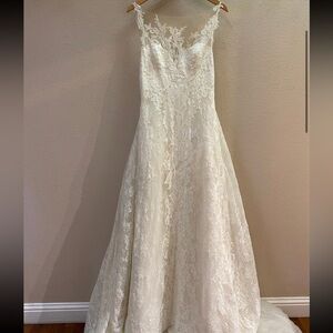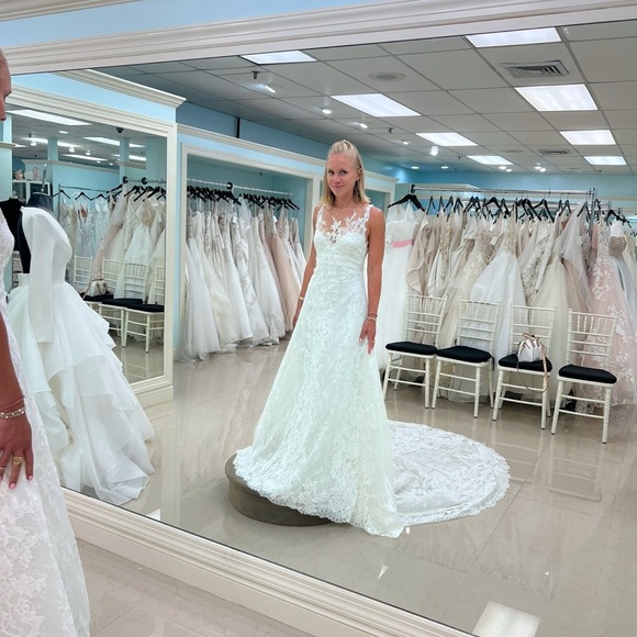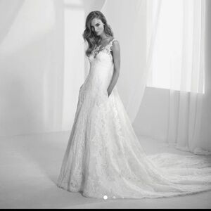 Sample sale, unaltered, Pronovias lace radila wedding dress. Gorgeous gorgeous soft Chantilly ivory lace with an illusion neckline. Amazing details. Size 14, never worn or altered. Purchased for my wedding as a back up but ended up getting something different! My loss is your gain! Retails over 5800$