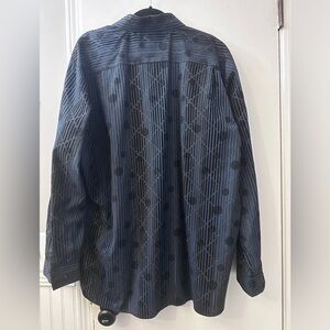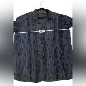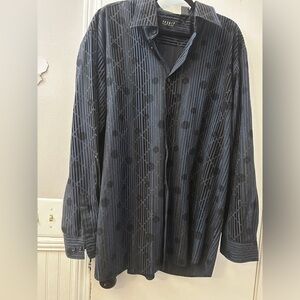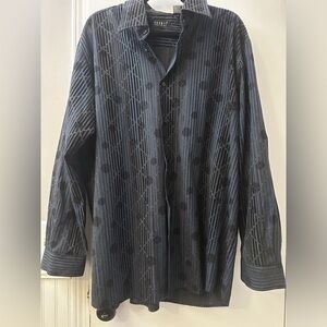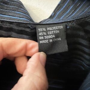 This Pronti Collection by Phita men’s button-up shirt in XXL is perfect for a night out or disco party. The black and blue striped design features shiny threads throughout, adding a subtle shimmer to the look. Made from a blend of 55% polyester and 45% cotton, it offers both comfort and a stylish, eye-catching appearance. The unique detailing and vibrant fabric make this shirt stand out, ideal for any occasion where you want to make an impression. The pattern also includes subtle polka dots and diagonal stripes, giving it a dynamic feel. Pictures didn’t do it justice so I took a short video.