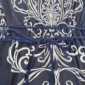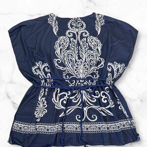 Pronto USA Women Blouse Blue/White Round Neck Batwing Short Sleeves Elastic Waist with a nice cord