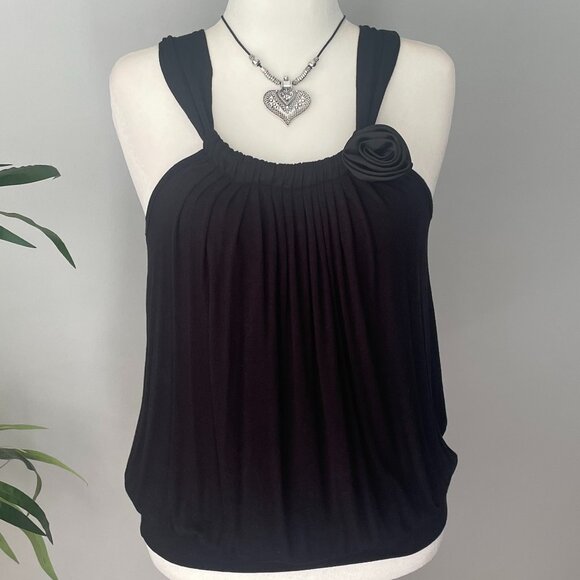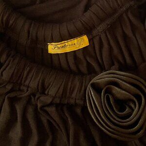 Pronto USA women's size M black pullover, blouson top, low round neckline, shoulder straps. Fabric is soft jersey. Black rose embellishment. 3" black jersey band at hemline. Condition is good, no tears, no stains, no flaws. Shoulder to hemline 29" to be bloused up. Machine wash cold delicate. Hang to dry. Fun for any casual or semi- dressy occasion. Necklace for sale but not included.