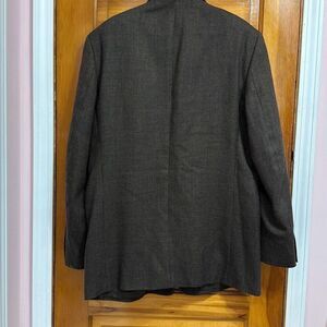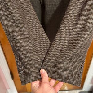Excellent condition 100% Lambswool two button blazer with faux front pockets. Brown, tan and slight blue woven wool. Looks mostly brown though. Men’s size US 44 long but measurements taken flat are approximately: