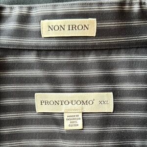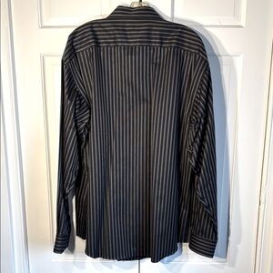 This Pronto Uomo dress shirt features a sleek black color with a classic pinstripe pattern, offering a sophisticated look. Made from a smooth cotton fabric, it provides comfort and elegance for formal or casual occasions. The shirt's relaxed fit and standard pointed collar make it a versatile addition to any wardrobe.