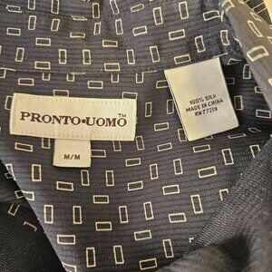 Pronto Uomo Black Silk Shirt Men Sz M Tan Geometric Pattern Short Slv Button Up