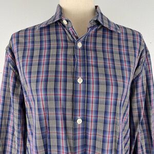 Stylish button-down dress shirt featuring sharp colors and in excellent preowned condition. It measures 23 inches across the chest laying flat and it’s 28 inches in length from the shoulder to the hem.