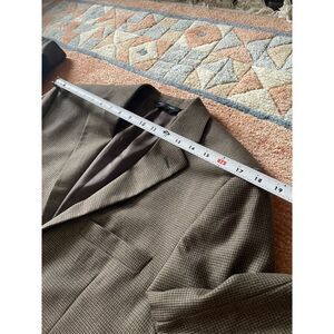 Pronto Uomo Couture men’s blazer in size 40 Regular, made in Indonesia from 100% wool. Classic brown houndstooth check pattern, fully lined with multiple interior pockets, two-button front closure, notch lapels, and double back vents. Approximate measurements: length 31.5”, chest 21.5”, shoulder 18”. In excellent condition, clean and well maintained with no flaws. Timeless and versatile piece, perfect for business, office, or formal occasions.