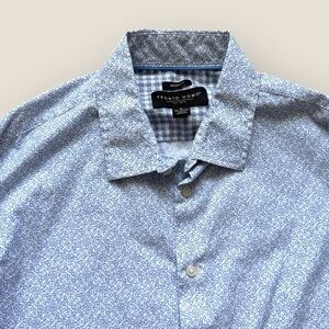 Elevate your wardrobe with this Pronto Uomo Modern Fit button-down shirt in a subtle micro floral print. Features a spread collar, long sleeves with button cuffs, and contrast checkered trim at the collar and cuffs for added style. Worn only once and in excellent condition with no visible flaws. Lightweight and breathable—perfect for both business casual and elevated everyday wear.