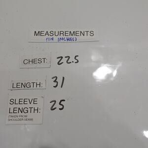 Actual Measurements (as noted on markerboard): Chest 22.5 in, Length 31 in, Sleeve length 25 in (taken from shoulder seam).