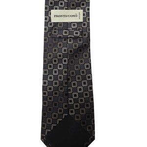 This stunning Pronto Uomo tie is crafted with 100% silk, offering a smooth and luxurious texture for stylish presentation. The intricate geometric checkered pattern, featuring black and gray tones, lends a modern aesthetic that complements professional or formal attire. Enhanced with neat stitching and precision detailing, this tie reflects quality craftsmanship. It is versatile and pairs effortlessly with various suit colors, making it an essential addition to any wardrobe. With its elegant design and premium material, this accessory is a blend of fashion and practicality, ready to elevate your outfit for any occasion.