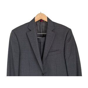 A classic tailored suit set in charcoal gray with a subtle plaid pattern, ideal for professional or formal settings. Comfortable and versatile.