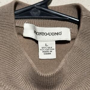 The Pronto Uomo Sweater in men's size large is a stylish and versatile piece perfect for various occasions. This brown mock neck sweater features a tight-knit design with long sleeves, making it a warm and durable garment. With its vintage appeal and classic style, it pays homage to characters like Tony Soprano, offering a touch of old money charm. Made from a blend of silk and cotton, this lightweight and breathable sweater is machine washable for easy care. Perfect for travel, parties, casual wear, work, or business, this sweater is a must-have for any fashion-forward man looking to add a touch of preppy hipster flair to their wardrobe. Measurements are listed below as well as in the photos.