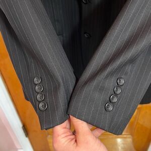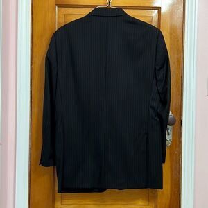 Excellent condition 100% wool black pinstriped blazer/suit jacket. Men’s size 41 regular but measurements taken flat are approximately: