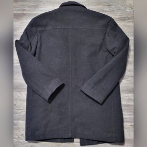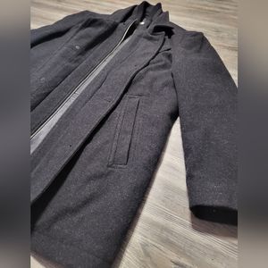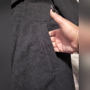 This is a 70% wool, 20% Nylon, 10% Cashmere coat. This coat has a zipper and 5 button closure in the front. It has 1 zipped pocket inside left and 2 inside right. Coat also has 2 slip pockets in the front. Coat is CLEAN AND IN EXCELLENT CONDITION.