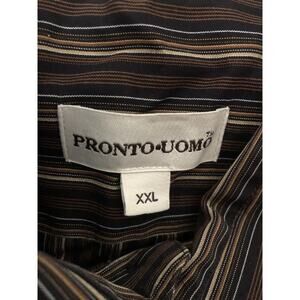 This is a Pronto Uomo dress shirt in size 2XL, featuring a black/brown striped pattern with a collared neckline and button closure. It has long sleeves and is made of cotton fabric with a medium wash. The shirt is suitable for party, formal, and business occasions, and has a regular fit with a point collar style.