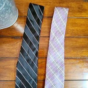 Men's striped ties. A Pronto Uomo Couture purple with silver, grey and white colors. A black tie with white and silver striping. (No brand tag)