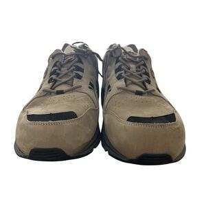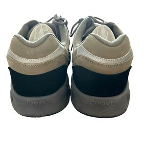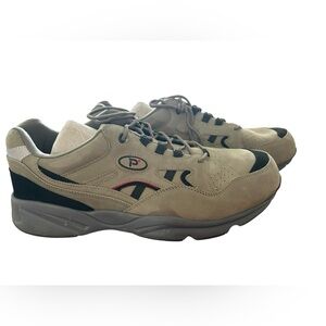 Propet athletic shoes in tan and black. Sturdy build with comfortable fit. Perfect for sports and casual wear.