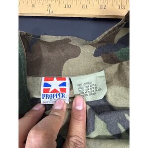 Authentic Propper military BDU shirt jacket in woodland camouflage. Classic 4-pocket utility design, button front, and durable cotton/poly blend construction. Made to U.S. military specifications. Tagged Large Regular (fits height 67–71", chest 41–45"). Great for tactical wear, workwear, or vintage streetwear styling.