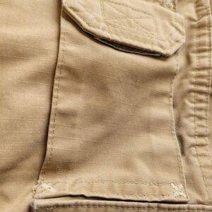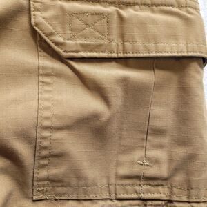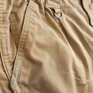 Very well made shorts. Lots of pockets front and back. Zipper cloth is fraying some. See pic. Made of 65% polyester and 35% cotton. Tag says size 42.