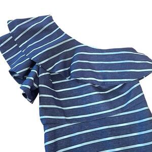 Blue and white striped pattern, one shoulder style with a ruffled neckline, drop waist, ruffled hem, mini length. Fully lined. Beautiful designer dress, retailed for $495.