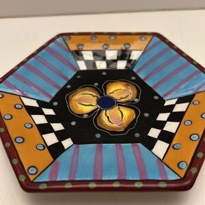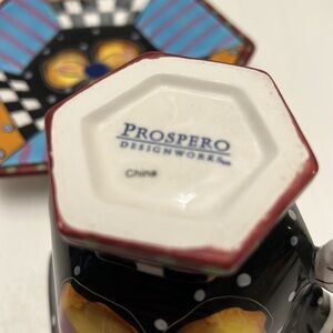 Here is a Prospero Designworks Coffee Tea Cup & Saucer Flowers & Hexagon. I started collecting pieces from this company because they were less expensive then Mackenzie Childs and they were very cute. This is in fine unused condition with no damage.