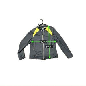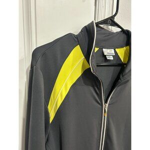 Lightweight athletic jacket with a full zip, high collar, and side zip pockets. Bright yellow accents add a sporty, vibrant touch.