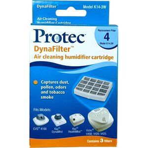 Keep your air fresh and clean with the Protec DynaFilter K14-3W Replacement Humidifier Filter #4. This two-stage cartridge helps capture dust, pollen, and odors using a cross-woven polyester and activated carbon system. Compatible with Kaz and Vicks cool mist humidifiers.