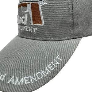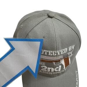 “Protected By The 2nd Amendment” New-without-tags Gray Hat/Cap. Includes cardboard liner. Adjustable sizing with hook-and-loop closure. One size adults. Cotton-polyester canvas. Some scuff marks from storage (see photos) — in otherwise new condition. No rips, stains, or holes.
