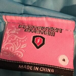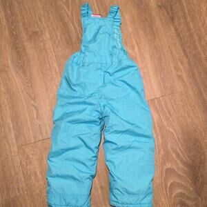 Lightweight quilted snow bib with adjustable straps. Elastic on back at waist for stretch. Aqua and light purple. Tagged size 4. 11oz.