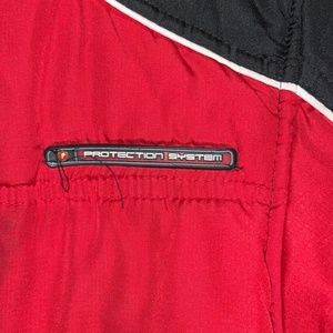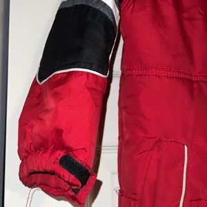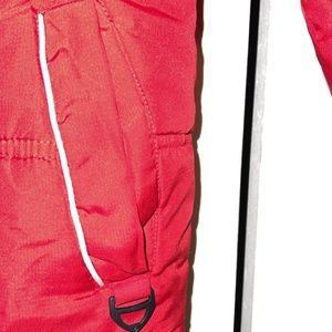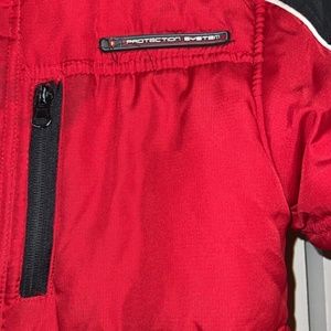 Protection Systems boys red coat. Size 7. shell, ining, and filling are all 100% polyester. Pocket on each side along with left breast pocket. Full zip with velcro cover. Velcro adjustment on wrists. Inside left pocket. Sleeves have black and white on it.