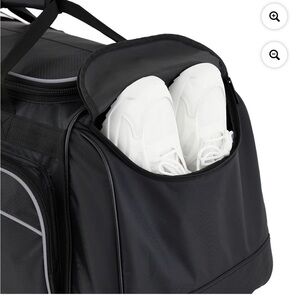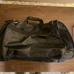 Versatile black duffel bag. Perfect for travel or gym use. Excellent Used Condition. Missing shoulder strap tho. Separate pocket for shoes & dirty clothes. Spacious with Many compartments to keep belongings seperate.
