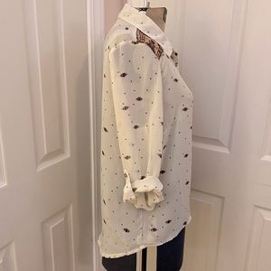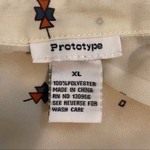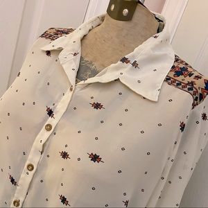 Prototype sheer off white Aztec print button up blouse with roll up sleeves, strap and button to secure. Size XL. In excellent used condition, from pet and smoke free home