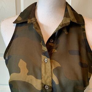 Prototype Camo print sleeveless button down collared blouse. Back is wrap style. Semi sheer. Perfect condition.