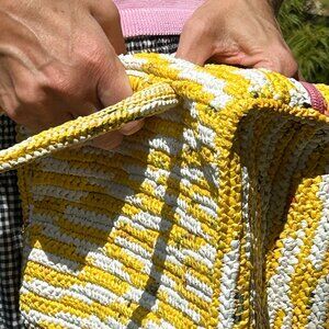 Hand crocheted by artisans in Dominican Republic using recycled plastic.Yellow and white with contrasting pink zipper. 10" wide x 7" high x 5" deep (gusset).