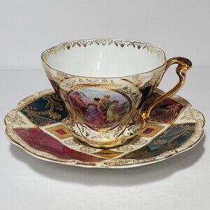 Vintage Vintage Prov Saxe ES Erdmann Schlegelmilch teacup and saucer. Muses and Cherub pattern. Some gold loss on the handle. Rare find! Unique pattern.