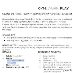 Elevated and feminine. Our Provence Pullover is not your average sweatshirt. Designed with ultra-cozy French Terry for the comfort you crave and a scalloped hemline that adds a polished, feminine feel to all your looks. This cozy pullover allows you to feel put-together without any extra effort - simply pair it with your favorite leggings for effortlessly easy style that goes from the studio to the street.