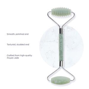 Experience radiant results, instantly. Our unique Dual-Action Jade Facial Roller features a smooth, polished end and a textured, studded end crafted from high-quality Xiuyan Jade.