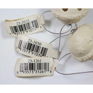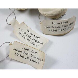 This Provo Craft lot contains 4 high-quality bisque porcelain ornaments. Three have tags marked Provo Craft, Spanish Fork, Utah. Included are two 2" x 2" jingle bells, a 3½" x 3½" puffy heart, and a 3" tall reindeer.