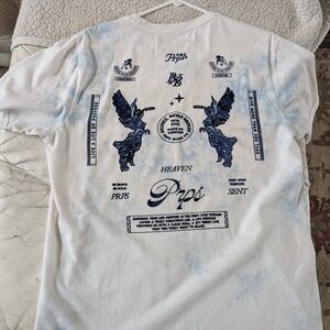 Pops Glory tie-dye t-shirt with blue and orange accents. Features a bold logo on the front.