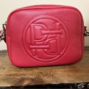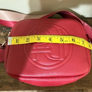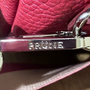 Depth: 3.1″ Chic red crossbody bag by Prune. Features an embossed logo and a stylish strap.