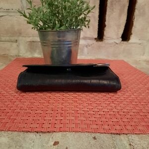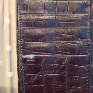 The Leather has a Crocodile skin pattern that is so soft with a snap closure. Interior features 11 slots for credit cards, 2 folds for bills, checkbook holder with an extra slot on the front, and a large pocket that is the length of the wallet. The back of the wallet has a zippered change purse holder.