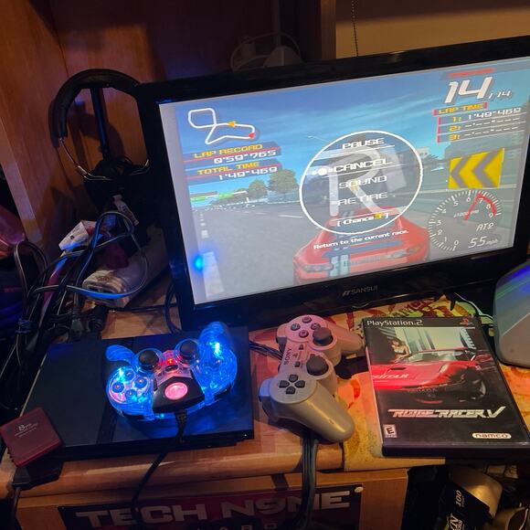 Good working all tested working properly, a ps2 slim with all hook ups, a red see through memory card, a grey owm controller, an afterglow pelican controller, a cib ridge racer v game, a mad catz 2 model steering wheel and a pelican steering wheel, and an extra mad catz pro 2 dual force controller asking ready for some 2 player racing shenanigans 175 obo