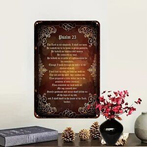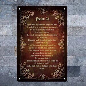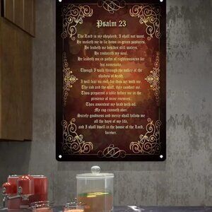This exquisite 8x12" metal sign beautifully displays the timeless words of Psalm 23, also known as "The Shepherd's Psalm," in an elegant old-style script font. The classic script adds a touch of vintage charm to the sign, enhancing its spiritual and artistic appeal. Designed with intricate scrollwork and warm, rich tones, this decorative piece brings a sense of peace and divine presence to any space.