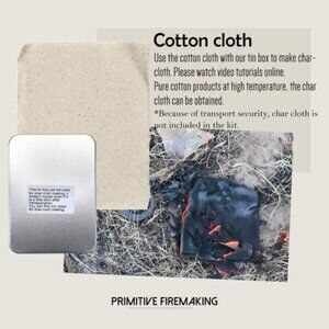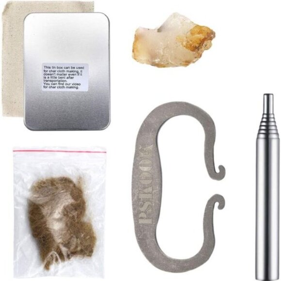 Pskook Fire Starter Flint Rock and Steel Striker Kit : Traditional high carbon flint and steel striker. Heat treated and polished for optimal spark production when struck again flint or quartz. Comfortable Size: Suitable for 4 fingers to grip. Overall size: 4.4cmx9cm/1.7"x3.5", Thickness: 0.5cm/0.2". Kit includes; 1 steel striker, 1 piece of flint, 1 piece of cotton cloth, 1 jute, metal tin to hold contents ✌Our fire steel produces sparks reaching high temperatures to ignite tinder. It also has up to 15,000 strikes. Imagine how many matches you would need to light 15,000 fires. This kit would make the perfect gift for anyone interested in bushcraft (the beginner and expert alike).Using PSKOOK Flint and Steel: Tips: This Kit does not contain charcloth due to the safety of transposition. A pure cotton cloth is included to help you make one. We have a video toturial online [ youtube channel: PSKOOK go]about how to make char cloth. Tin box and cotton cloth- Mini CarbonizationTool: Place a small piece of char cloth on the top of the flint as shown. The goal is to shave off a very small strip of metal that will burn and land on the char cloth. Striking down at about a 30-degree angle should create a spark or two, which will cause the cloth to glow red where they land. This often happens on the edge of the cloth and is hard to see in bright sunlight. If a spark lands on the char cloth, wait and blow gently on it until you see either a glowing crescent or nothing. If nothing, go back