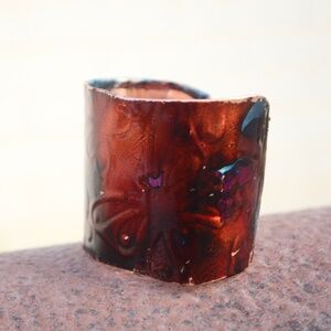 Thank you for looking at this brand new one-of-a-kind cuff bracelet, hand-forged from solid copper. I embossed the surface with a heart motif, then hand-painted it in shades of red, pink, and purple, sealing it to preserve the rich, colorful finish.